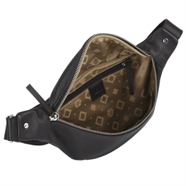 Tasken lukkes med lynlås og har indvendigt et stort rum, samt en lille lynlåslomme i linningen.