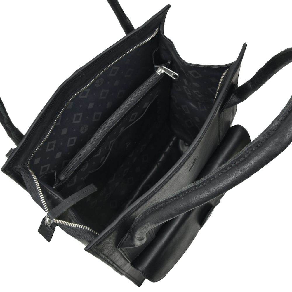 Tasken har et stort rum med lynlås og en computer lomme (30x22 cm) indvendigt. På taskens front er der en lille lomme med plads til småting.