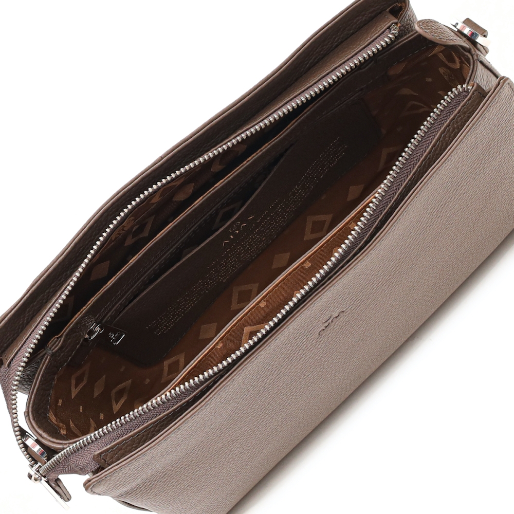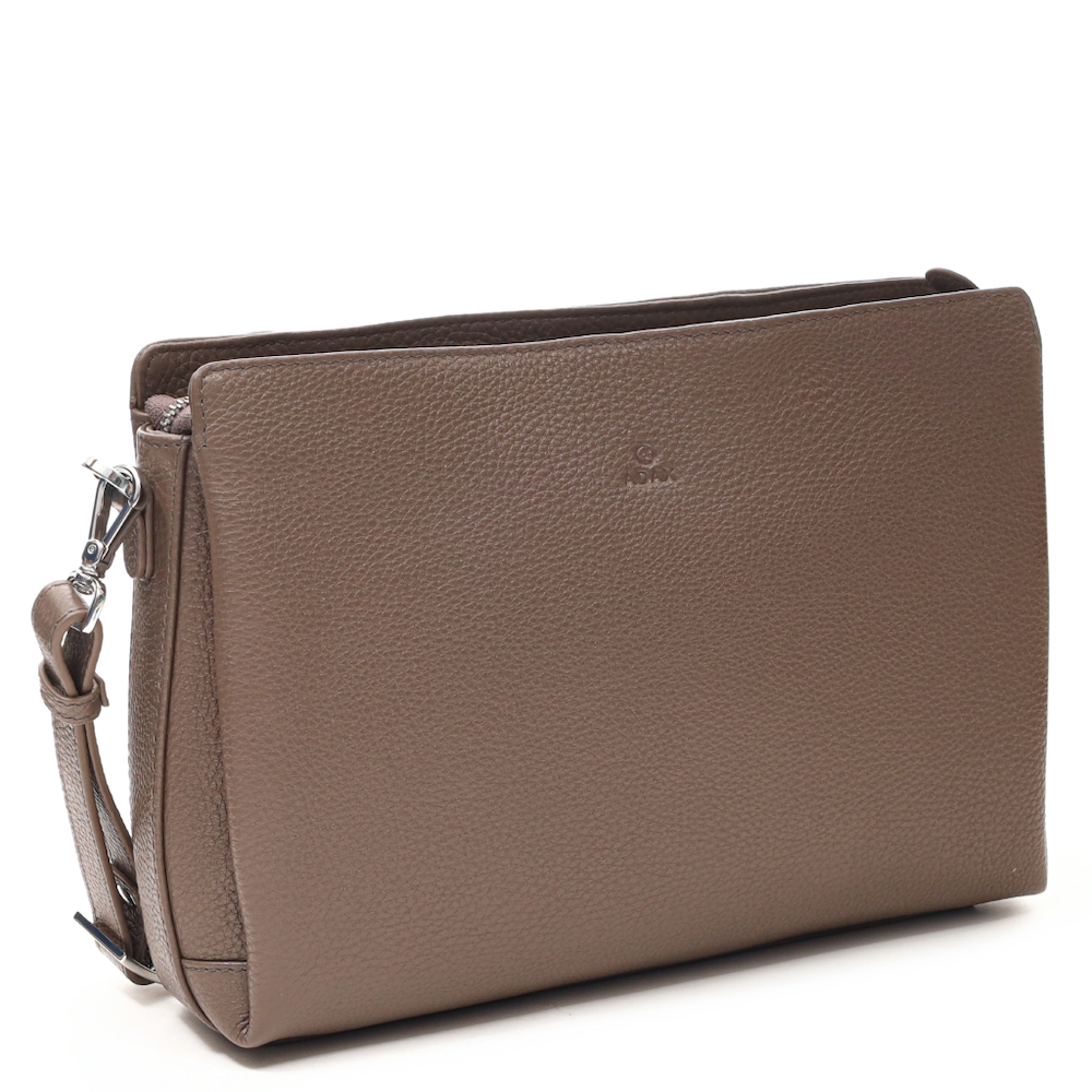 Elegant og praktisk skuldertaske i læder med et minimalistisk design. Tasken har flere lynlåsrum, der giver optimal organisering, og en justerbar, aftagelig skulderrem, så den kan bæres på forskellige måder. Perfekt til både hverdagsbrug og festlige lejligheder.