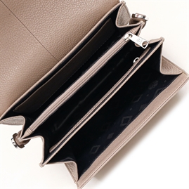Tasken lukkes af en klap med magnetknap, og indeholder 3 store åbne rum, 2 større lynlåslommer samt en mindre stiklomme i skind.