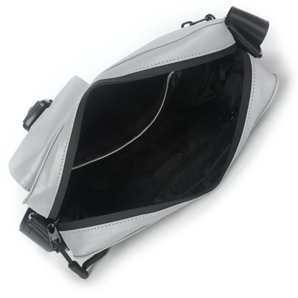 Tasken lukkes med lynlås og har indvendigt en mindre lomme med lynlås og en stiklomme i linningen.