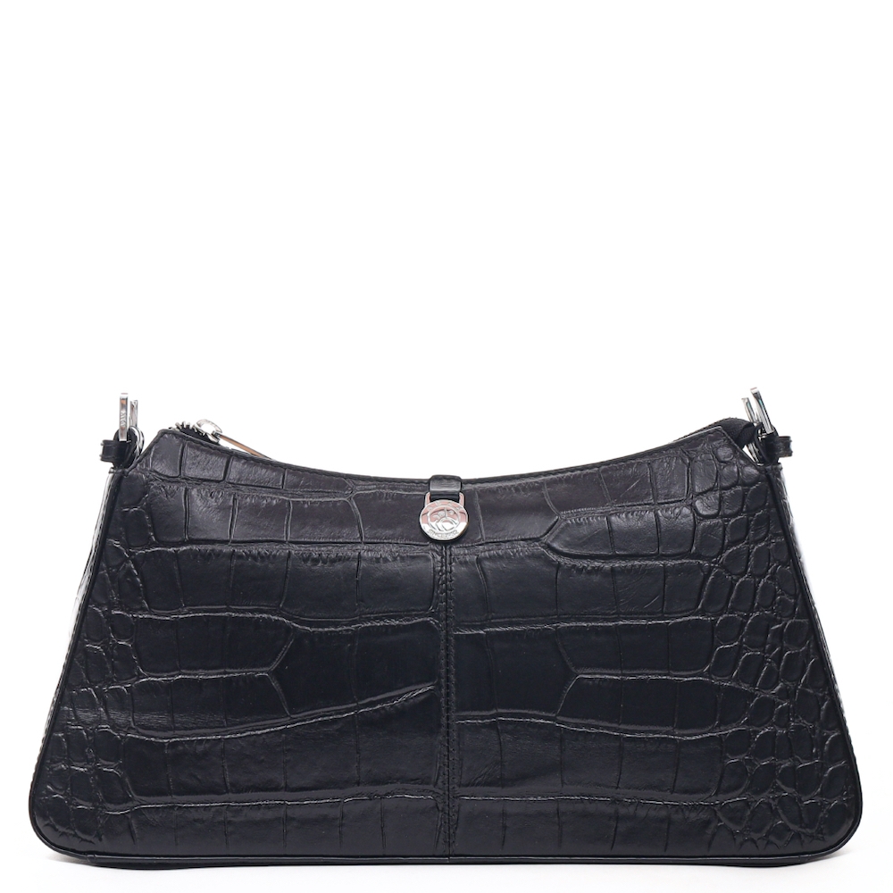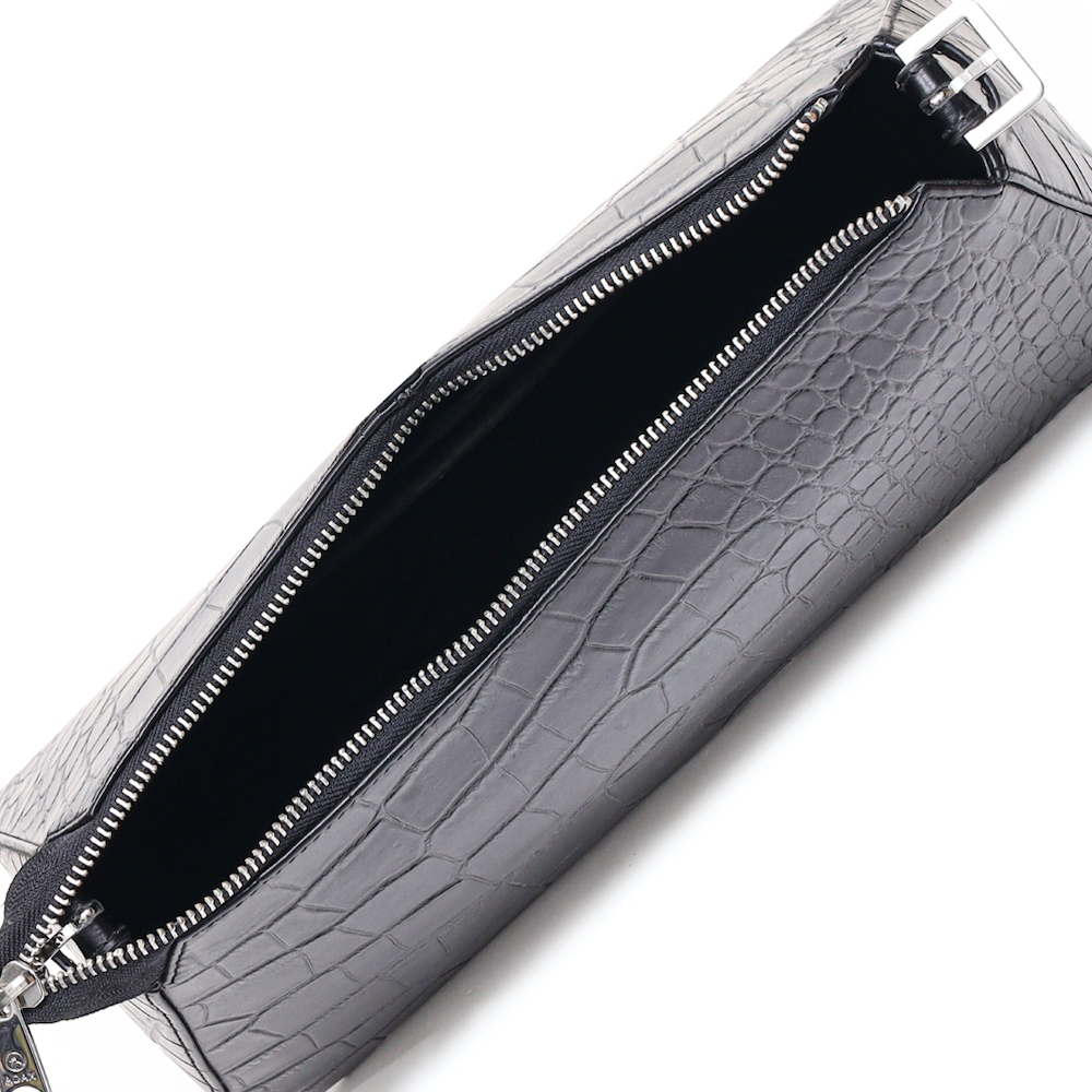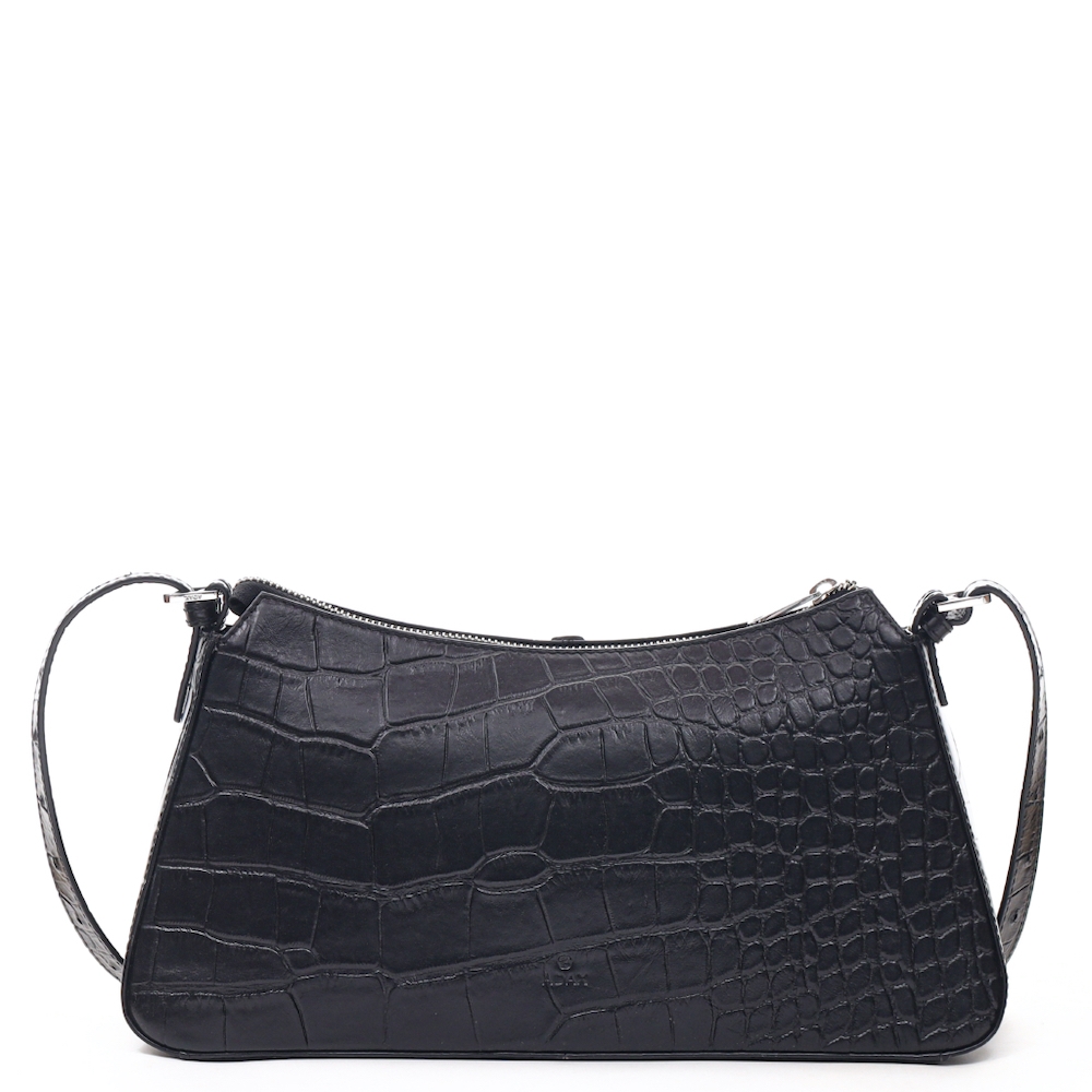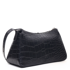 Lille og elegant skuldertaske i prægning med krokodillemønster. Tasken har en enkel form, der holdes af en fast bund og åbnes med lynlås. Indvendigt er der en lynlåslomme og en åben lomme til småting.