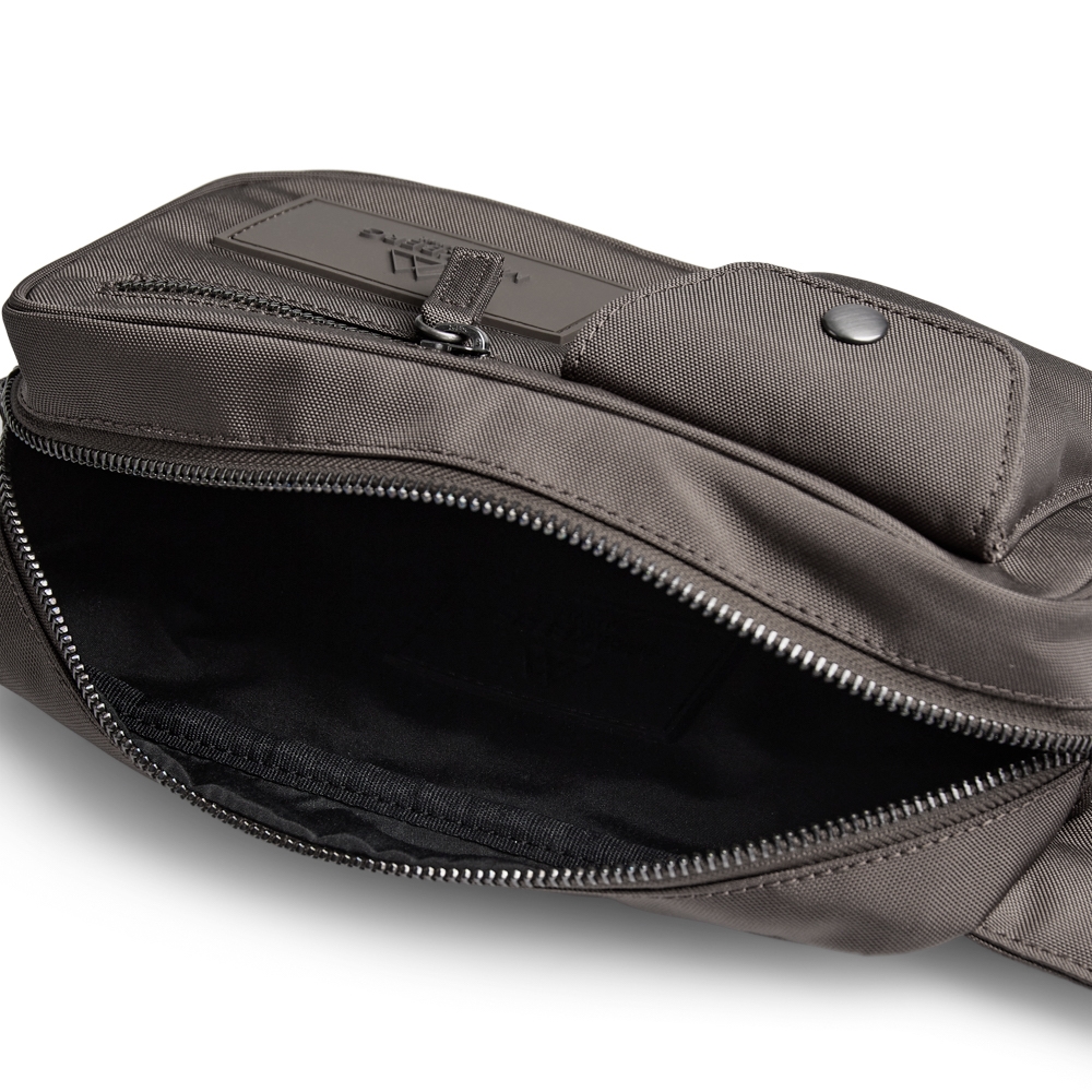 Indvendigt i tasken ses blot et stort rum. Fordi tasken ikke er opdelt i mange mindre rum kan den indeholde rigtig mange ting, og endda store ting. Derudover er det lækre materiale utrolig blødt, og tasken kan derfor nemt udvides og indeholde endnu mere, end ved første øjekast. Udvendigt har tasken yderligere tre rum. Et bagpå, som er en lomme i linningen der kan lukkes med en lynlås. Derudover et lomme af samme slags som bagpå, bare på fronten og mindre, da der ved siden af er et rum med knaplukning. Så selvom det indvendige ikke indeholder flere rum, bliver man trods alt ikke snydt for noget god opbevaringsplads udvendigt.
