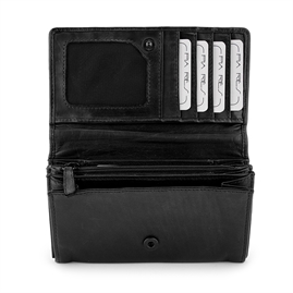 Pungen lukkes med et overslag med trykknap, hvor der er plads til mindst 5 kort. Selve pungen er opdelt i tre rum, hvilket giver et godt overblik over sedler, kort og kvitteringer. Det bagerste rum har yderligere plads til mindst 3 kort og adskilles fra midterrummet af en lynlåslomme. Udenpå lynlåsrummet findes en praktisk netlomme, velegnet til billeder eller kørekort.