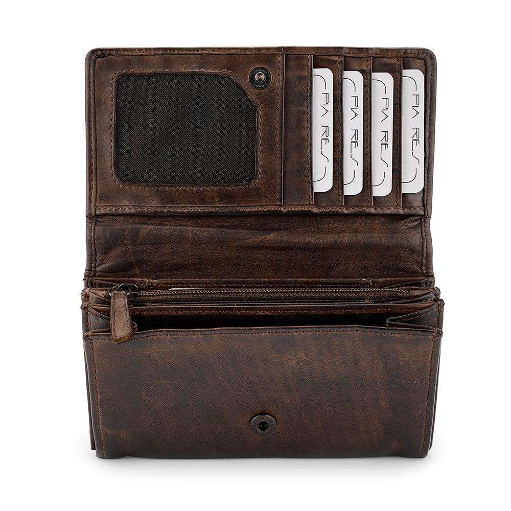 Pungen lukkes med et overslag med trykknap, hvor der er plads til mindst 5 kort. Selve pungen er opdelt i tre rum, hvilket giver et godt overblik over sedler, kort og kvitteringer. Det bagerste rum har yderligere plads til mindst 3 kort og adskilles fra midterrummet af en lynlåslomme. Udenpå lynlåsrummet findes en praktisk netlomme, velegnet til billeder eller kørekort.