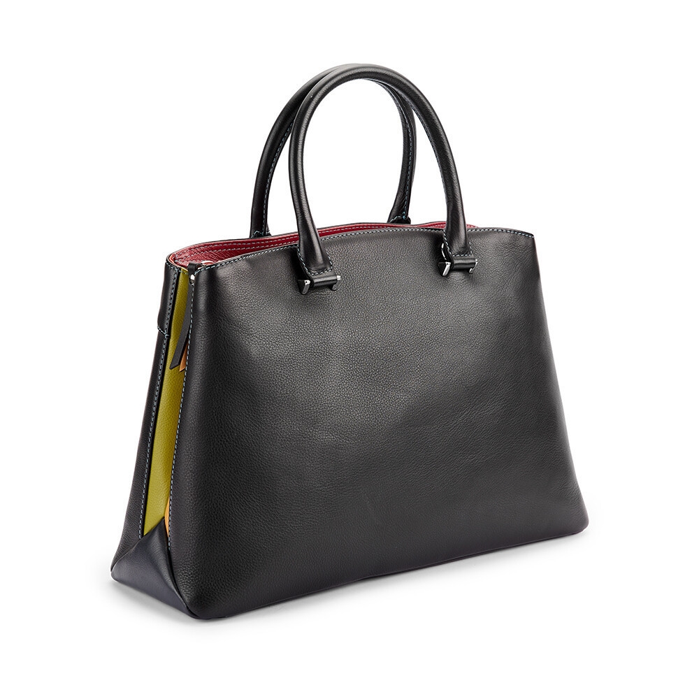 Elegant og detaljeret håndtaske fra Pia Ries i en flot kombination af sort og multifarvet kalveskind.