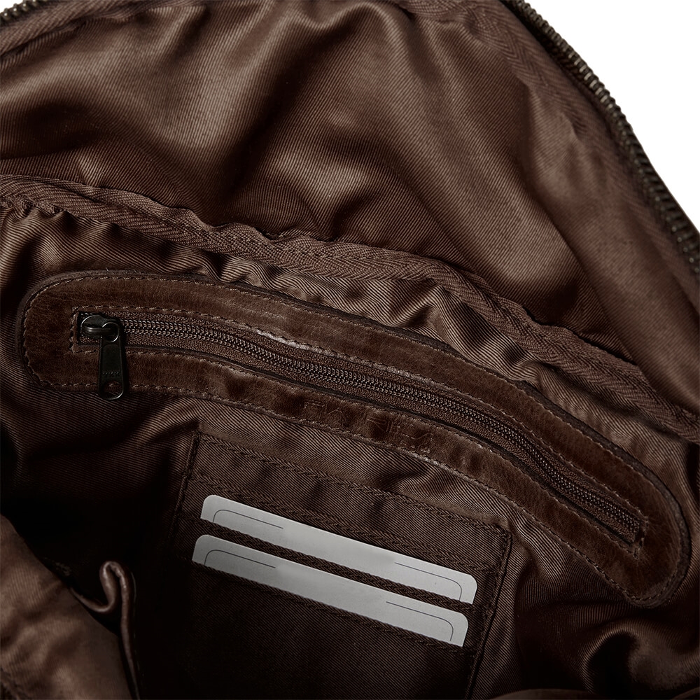Tasken lukkes med lynlås og har indvendigt et stort rum, samt en mindre lynlåslomme, en åben stiklomme samt 4 kortrum i linningen.